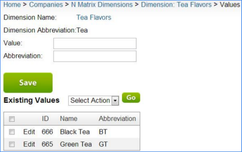 - Click Manage Values to edit values (such as colors, sizes, flavors, etc.).
