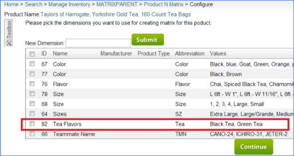 - Choose the dimensions to add to this product (if necessary, add a new dimension) > Continue (at bottom of page).