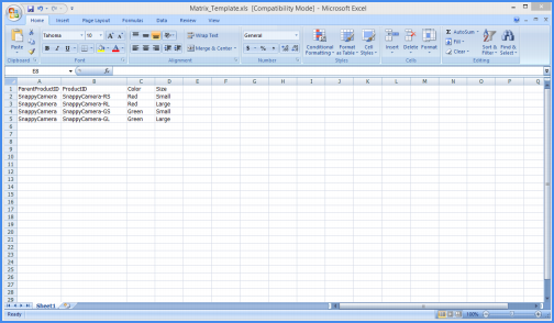 - In the ProductID column, enter the product ID of the variation product. If the Product ID matches an existing SKU in your catalog, that SKU will be configured as a matrix child. If the SKU does not exist, the import will create it and configure it as a matrix child.
