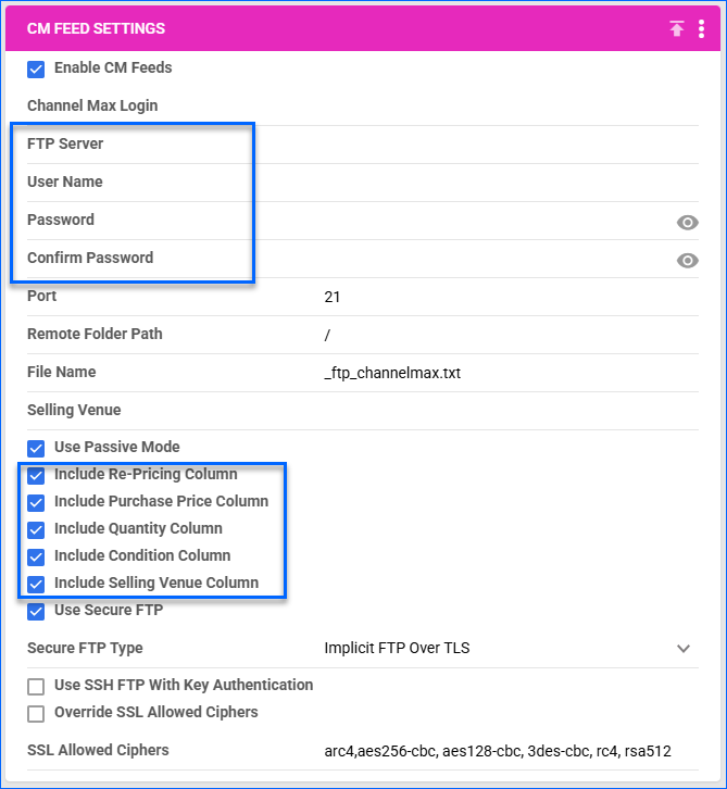 - In the CM Feed Settings section, enter your FTP details from the prerequisites – FTP Server, User Name, and Password. Optionally, to use SFTP, check the Use Secure FTP box.