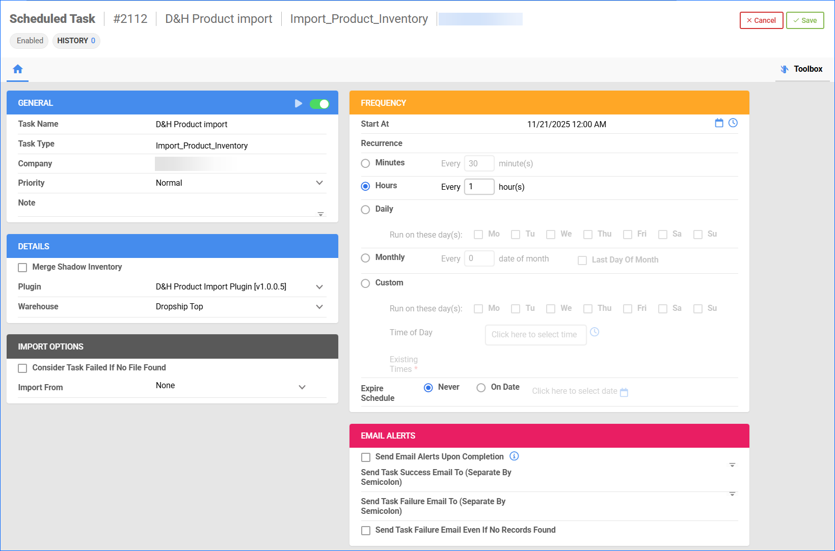 To create a Scheduled Task that regularly imports inventory from D&H into Sellercloud: