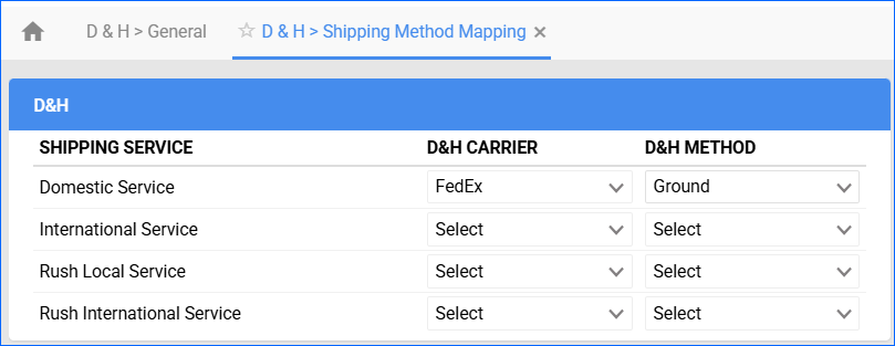 - In the Shipping Service fields, select D&H Carrier and D&H Method.