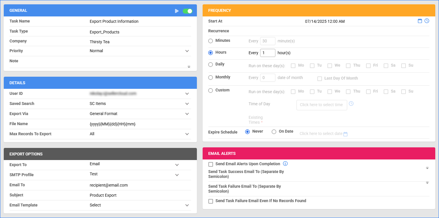 You can use a Scheduled Task to automatically export product data and send it to an Email Address, FTP Server, or VAN on a recurring schedule. To set this up: