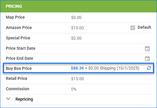 Sellercloud allows you to check the current Buy Box and shipping price based on a matching ASIN, and save it back to your products. You can perform this action individually and in bulk.