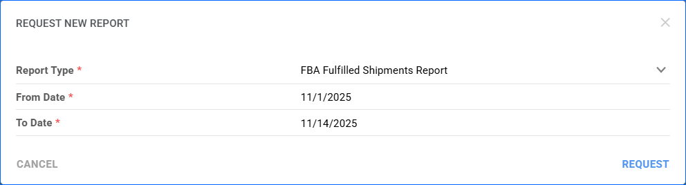 - Select FBA Fulfilled Shipments Report in the Report Type dropdown. The timeframe for the report should not exceed one month.
