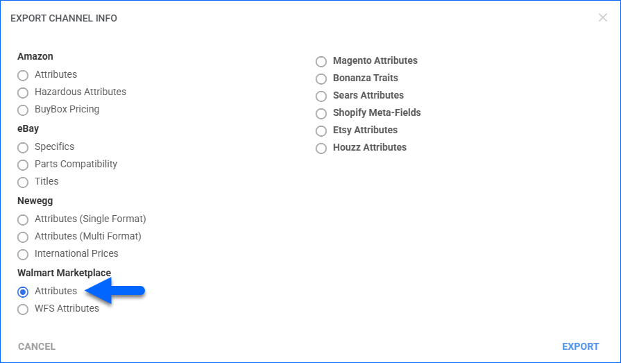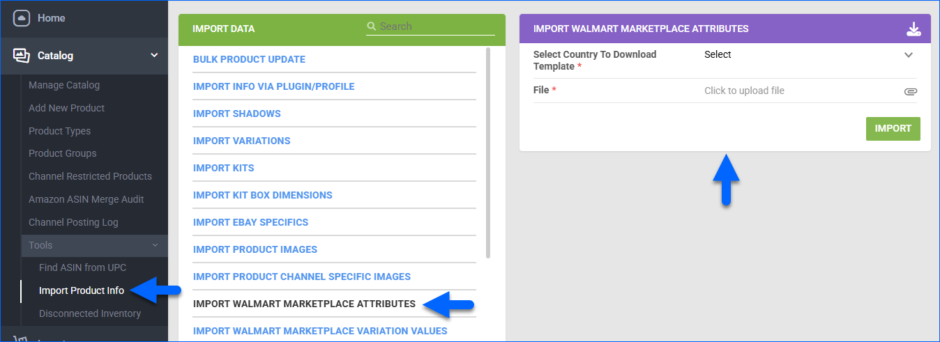 - Go to Catalog > Tools > Import Product Info > Import Walmart Marketplace Attributes.