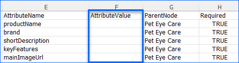 - Populate the AttributeValue column. See the Walmart Attributes Template Headers section for more information about the columns in the template.