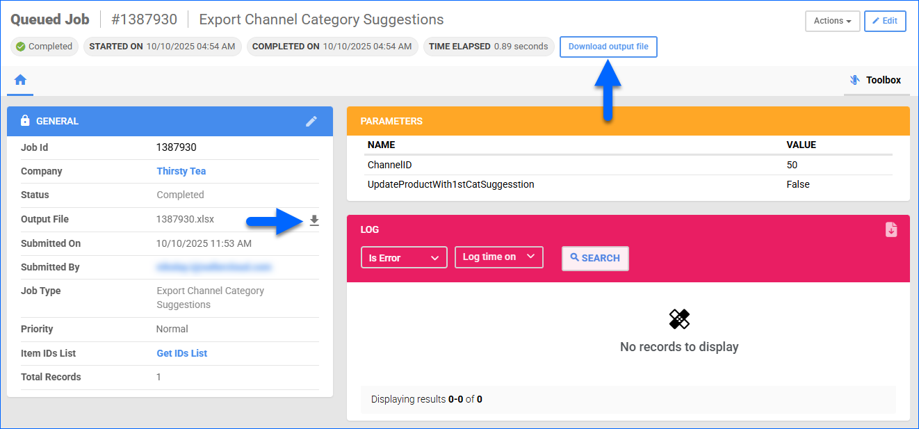 - You will receive a Notification once the job is finished. At this point, the job’s Status changes to Completed, and the file is ready to download. On the Queued Job Details page, click the Download output file button at the top right or the download icon next to the Output File field in the General panel.