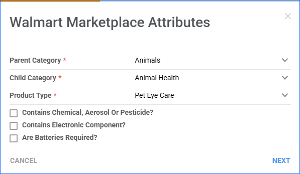 When configuring products for Walmart Marketplace, you must select the Parent Category, Child Category, and Product Type first, because they determine what attributes will be available.