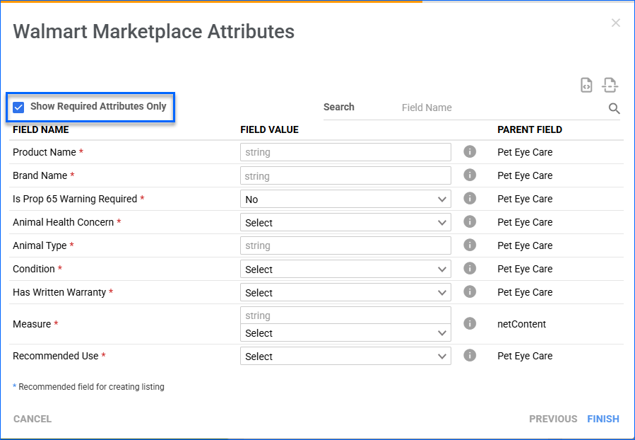 - Next, the list of attributes associated with the selected category will appear. You can keep Show Required Attributes Only checked to only see the Required ones.