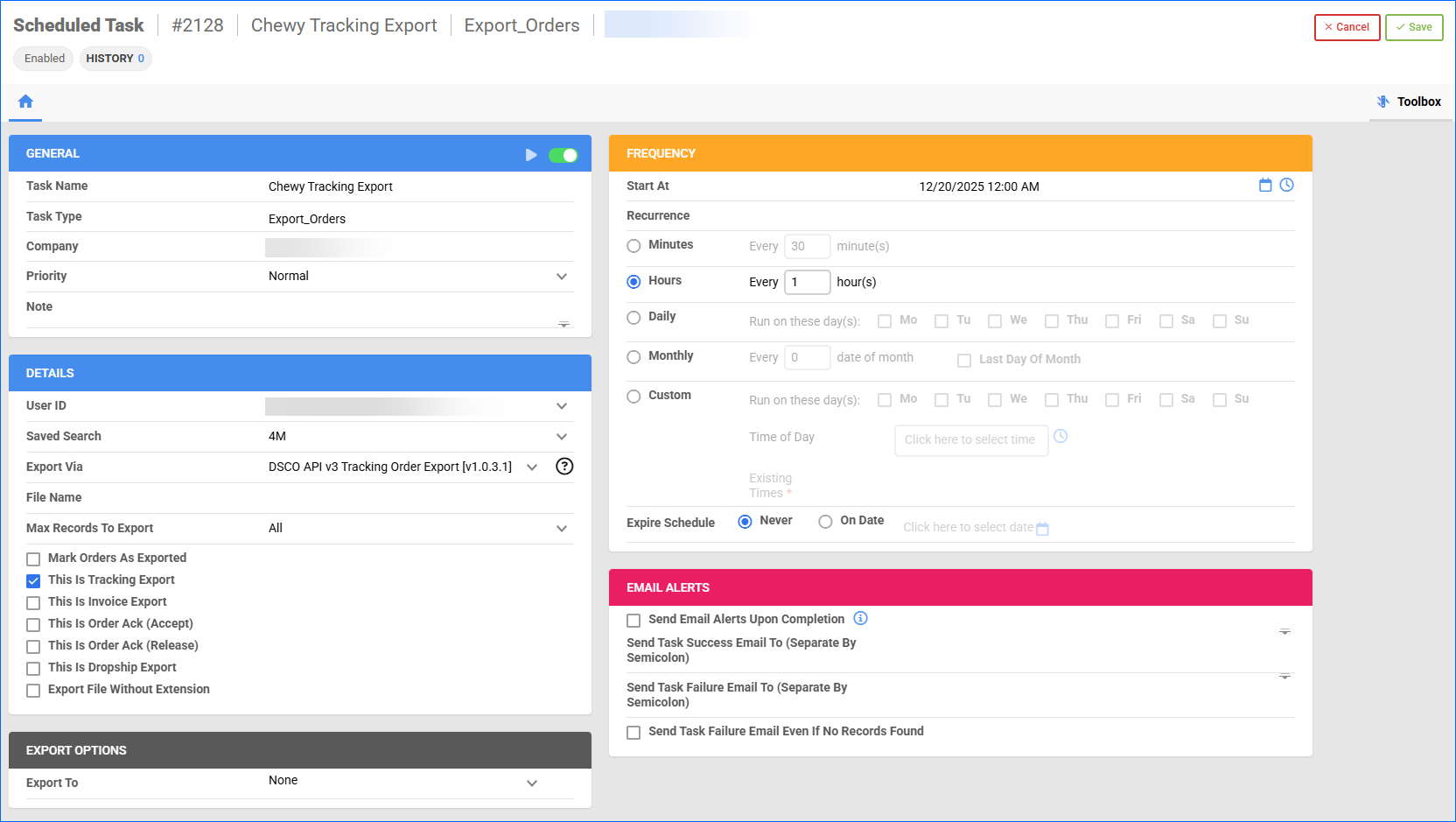 - Click the Export Via menu and select DSCO API v3 Tracking Order Export.