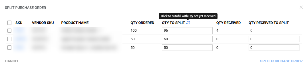 - Enter the quantities to split or click the rotating arrows icon to automatically fill in the quantities that have not been received yet.