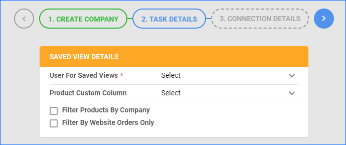 Task Details is step 2 of the Plugin Wizard. In this step, you set up the Saved Views and Scheduled Tasks for the integration.