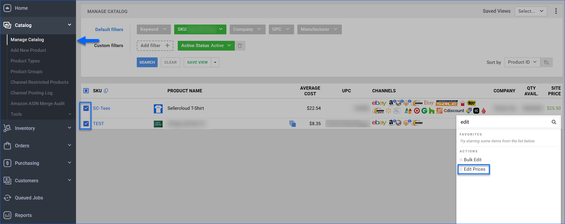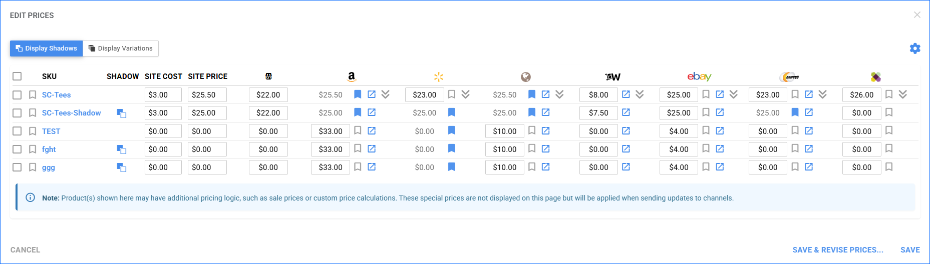 With Sellercloud’s Price Manager, you can manage a product’s Site Cost, Site Price, and prices for multiple channels at once.