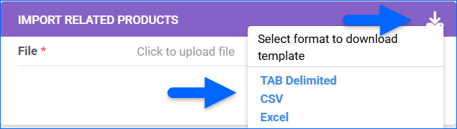- To generate a pre-configured template, click the Download icon on the top right and choose the desired format (either TAB Delimited, CSV, or Excel).