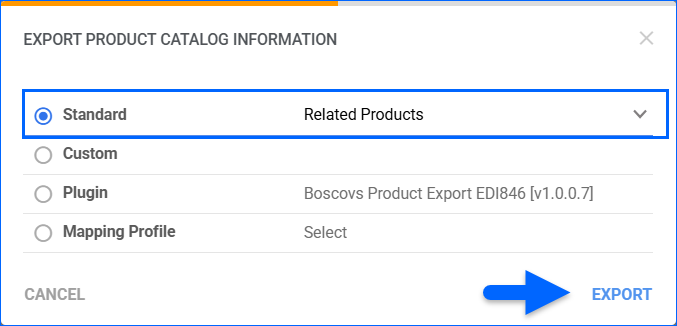 - In the Export Product Catalog Information dialog, click the Standard option, and select Related Products from the dropdown list.