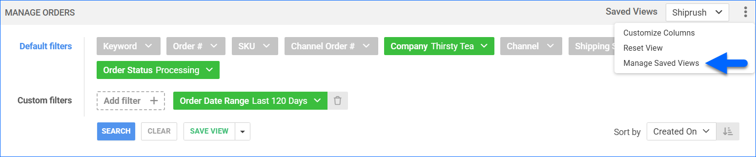 To apply additional filters, create a search that includes the above, plus any other criteria based on your preference. After the search is created, you can locate its ID by going to Orders > Manage Orders > Manage Saved Views.