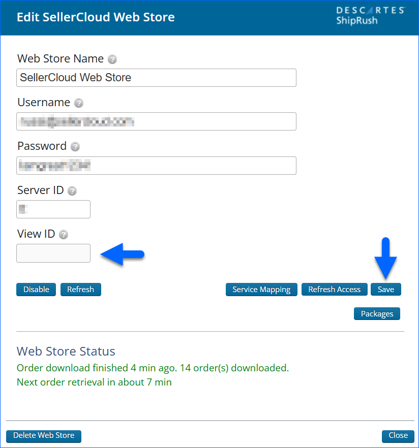 Next, to apply the search in ShipRush, go to Sellercloud Web Store > Edit > View ID and enter the ID of the Saved View you created in Sellercloud.