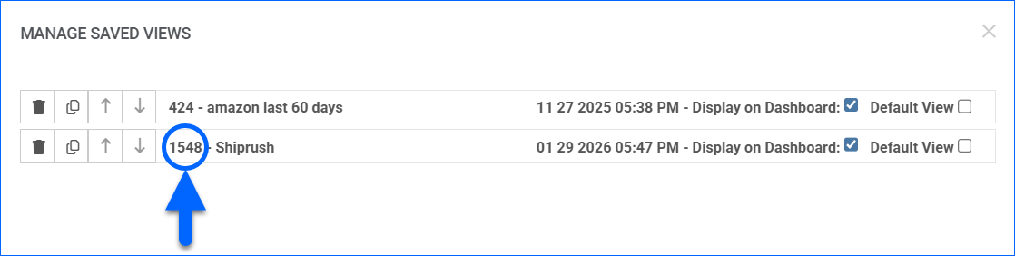 To apply additional filters, create a search that includes the above, plus any other criteria based on your preference. After the search is created, you can locate its ID by going to Orders > Manage Orders > Manage Saved Views.
