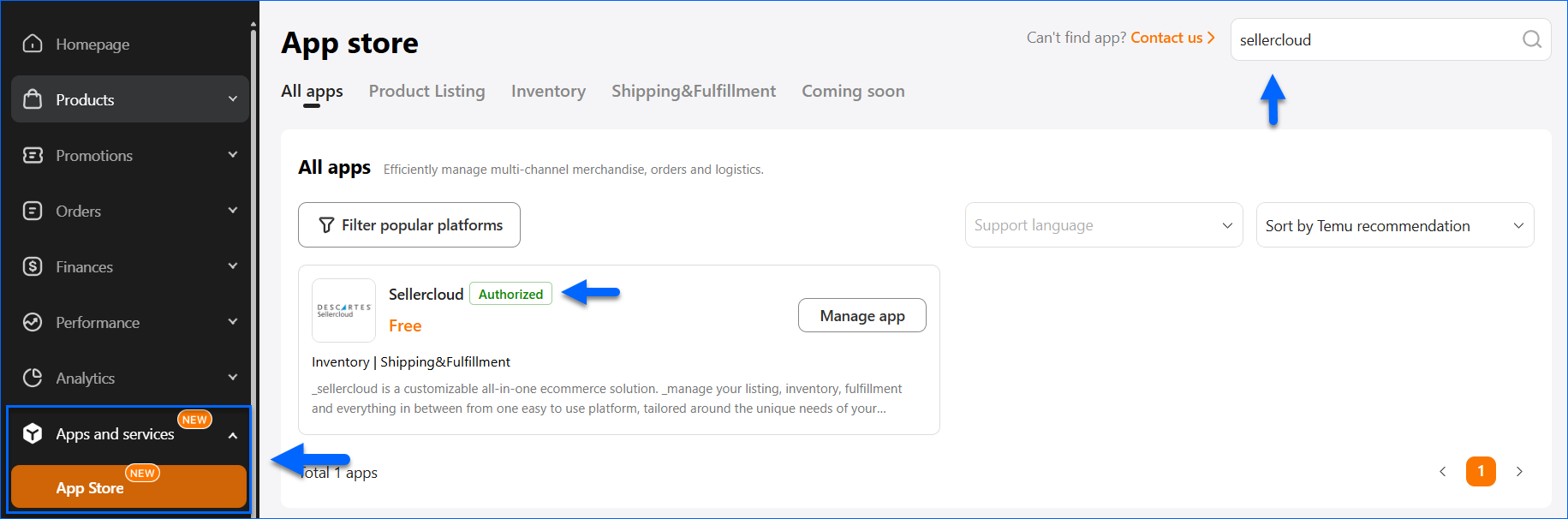 - In the top right, search for Sellercloud.