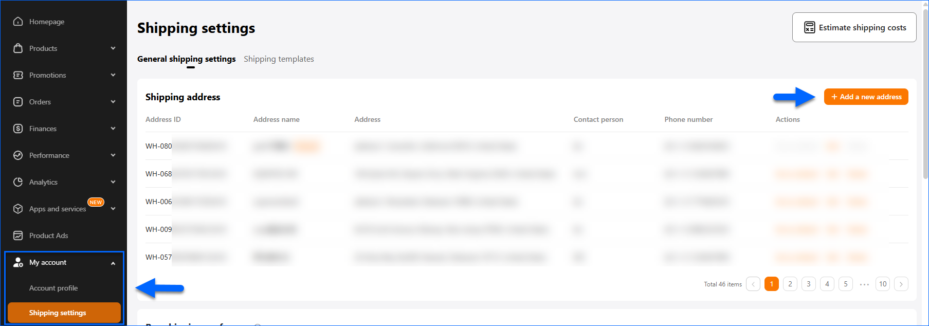 - On the left-hand side menu, click My account > Shipping settings.