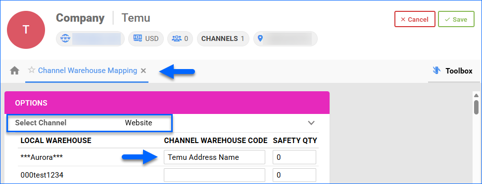 - From the Toolbox, click Channel Warehouse Mapping.