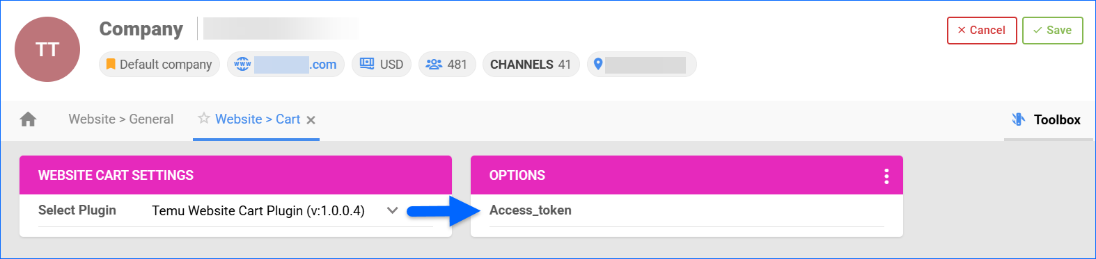 - In the same Company, go to Toolbox > Website Cart General Settings.