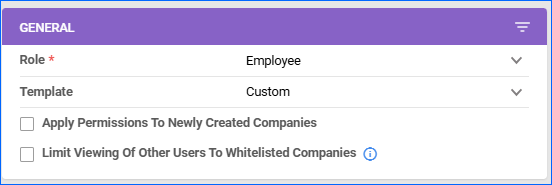 - Apply Permissions To Newly Created Companies – Only available for Employees. When enabled, each new company that is created in your account will be automatically checked in the For Company panel of the user.