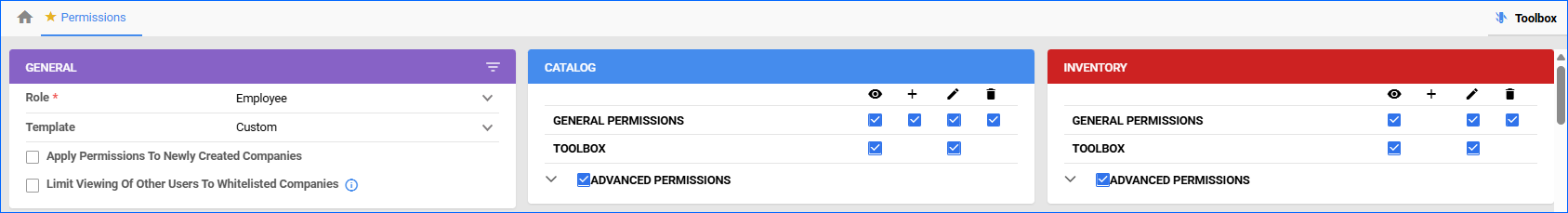 This section describes all the available Advanced Permissions on the Employee Permissions page.