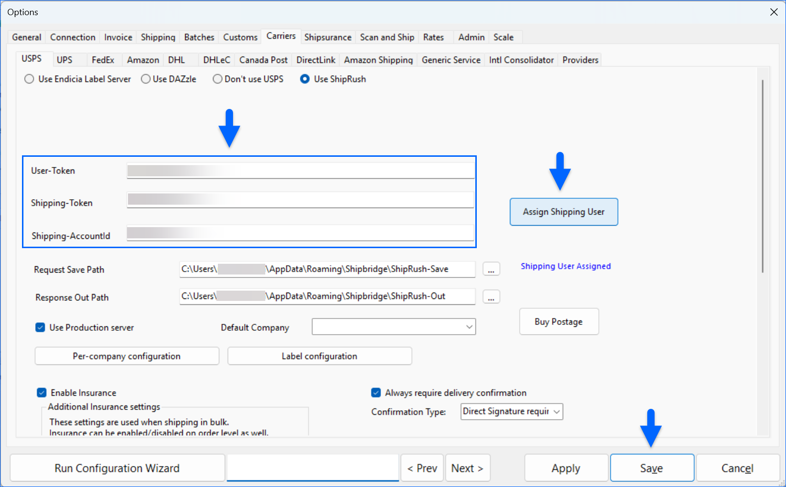 Once the User-Token, Shipping-Token and Shipping-AccountId are in their respective fields in Shipbridge, click Assign Shipping User, select your Default Company, and click Save.