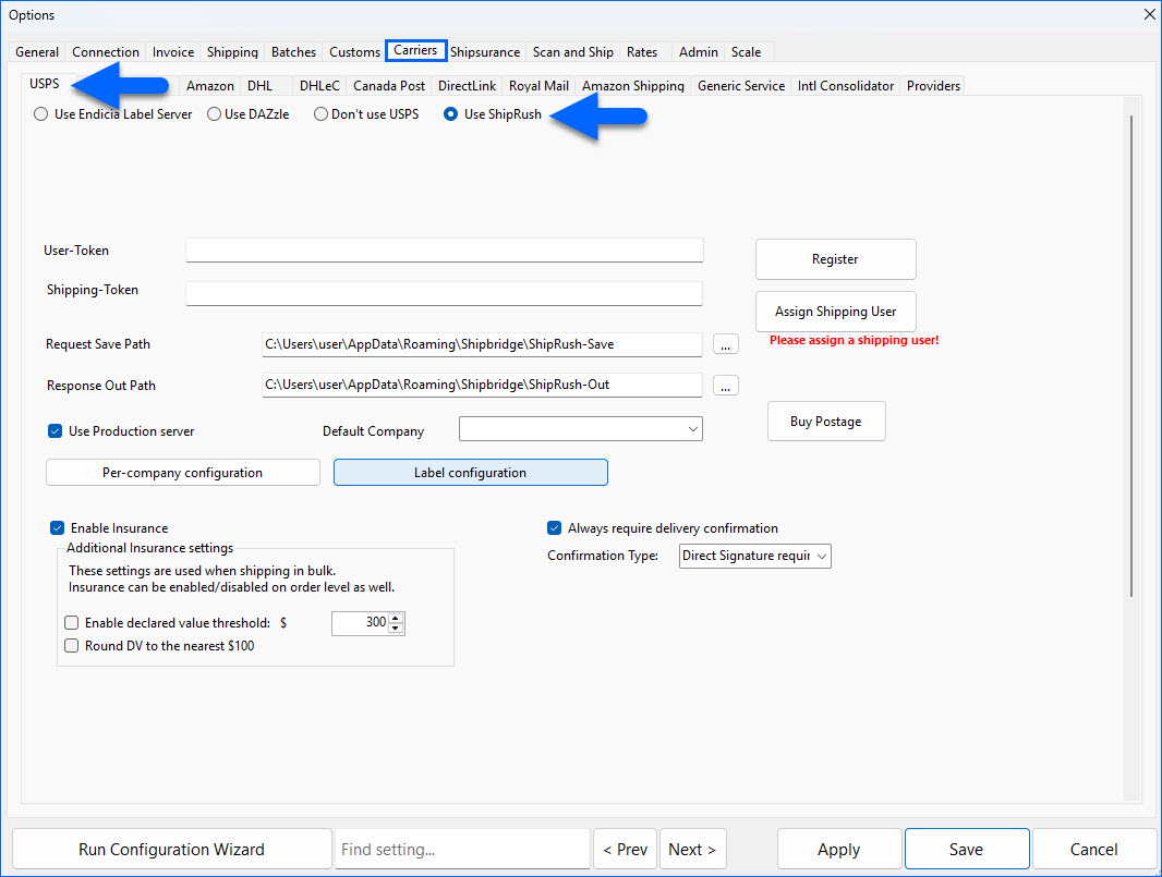In this article, you will learn how to enable and configure ShipRush within Shipbridge to generate USPS labels.