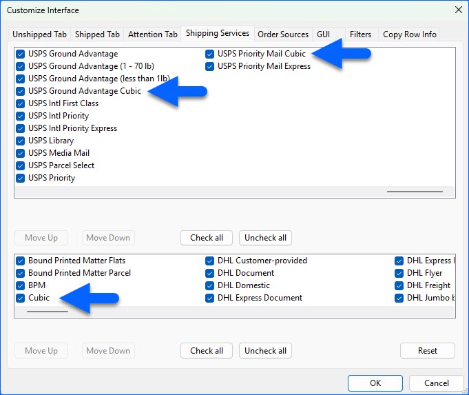 - Next, go to Menu > Customize Interface > Shipping Services and ensure that the relevant cubic services are enabled.