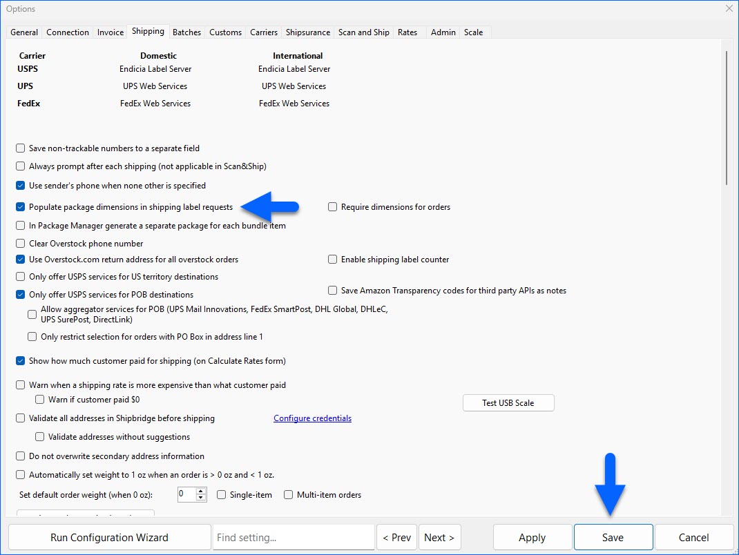 To calculate cubic rates in Shipbridge, package dimensions must be included in your shipping label requests. To do that: