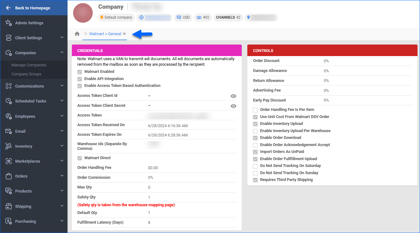 | Walmart Enabled | When you enable Walmart DSV for the selected company, you allow Sellercloud to communicate with Walmart automatically. If you enable this checkbox only, you choose to proceed with EDI integration configuration. |